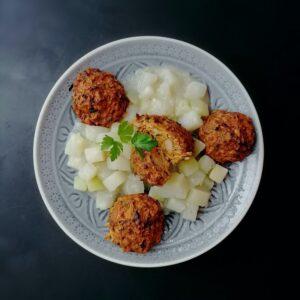Die Jackfruit – Frikadellen und das Kohlrabi Gemüse anrichten und genießen. Die Jackfruit enthält viel Vitamin C, unterstützt das Immunsystem und außerdem liefert es auch Eisen. Ist kalorienarm 100 g haben nur 40 Kalorien, es ist ballaststoffreich, fettarm, glutenfrei und vegan.