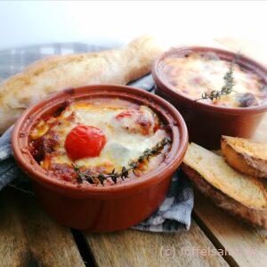 Zubereitung: Alle Zutaten vorbereiten, d.h. putzen; Spitzpaprika, in Würfel schneiden. Champignons, vierteln. Knoblauch in Scheiben schneiden. Von den Tomaten den Strunk entfernen. In einer Pfanne mit 1 EL Olivenöl die Knoblauchscheiben anrösten, rausnehmen in einem Schüsselchen beiseitestellen. Mit der Spitzpaprika und den Champignons gleich verfahren. Etwas Wasser hinzugefügt sorgt dafür, dass die Spitzpaprika schneller gar werden. Den Strunk der Tomaten entfernen, pürieren und als letztes in der Pfanne unter Hinzugabe eines Klecks Tomatenmark und einem Spritzer Honig zu einer Sauce verrühren. Die Cocktailtomaten hinzufügen. Jetzt ist alles fertig und kann in einen Schmortopf oder wie bei uns in zwei kleine Schmortöpfchen gestapelt werden. Reihenfolge: Hälfte der Tomatensauce und ein paar der Cocktailtomaten auf dem Boden verteilen, die Champignons, die Spitzpaprika, die gerösteten Knoblauchscheiben und die Garnelen ebenfalls verteilen und mit dem Käse abschließen. Das ganze bei 190 ͦvorgeheiztem Backofen für höchstens 10 Minuten in den Backofen geben, so dass der Käse schmilzt. Alles andere ist bereits gar! Mit einem Stück Baguette, entweder selbst gekauft oder selbst gebacken, wie bei uns genießen, die Sauce ist einfach der HIT.