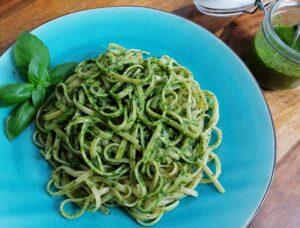 Zum Schluss würzt ihr das Pesto mit dem Olivenöl sowie dem gerösteten Sesamöl, dem Zitronensaft sowie einer Prise Salz.