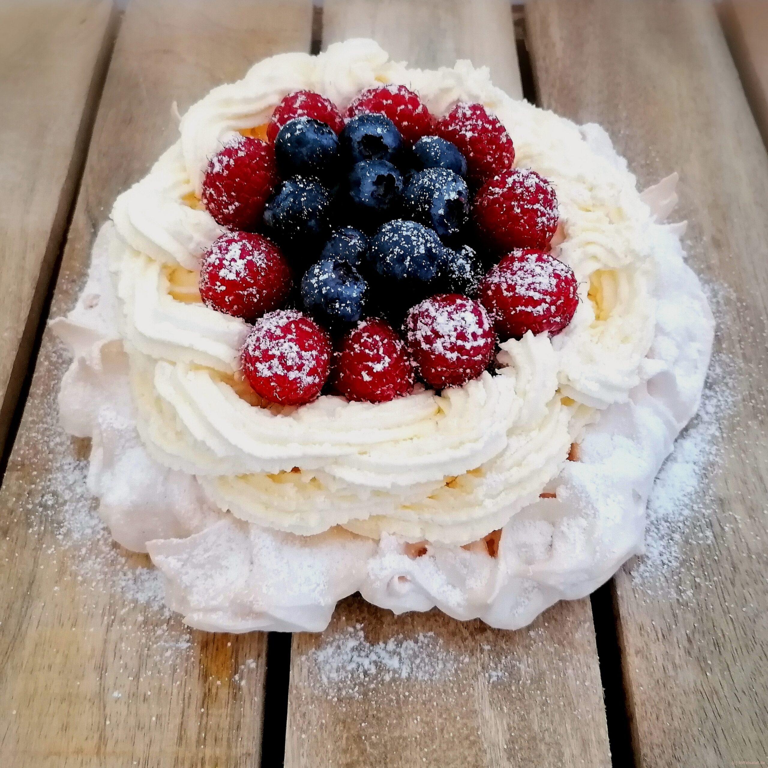 Für die Creme die Sahne steif schlagen und die Vanillecreme dazugeben. Die Creme auf die Pavlova dekorieren und danach die Früchte drauf verteilen. Leckeres Kaffeesieren