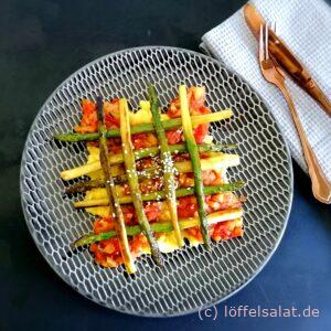 Anrichten: Blumenkohl- Kartoffelstampf auf einem Teller anrichten, das Tomatenconfit darauf verteilen und den karamellisierten Spargel als Gitter obenauf legen mit Sesam bestreuen und genießen.