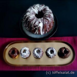 Since we took a smaller Guglhupf form than planned, we baked 6 mini Guglhupfe from a leftover batter and topped them with the remaining couverture and powdered sugar.