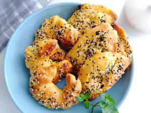 Jetzt den Teig in 10 große oder 20 kleine gleiche Teile aufteilen und eine Kugel formen. Die Kugeln mit den Händen zu einem Kreis arbeiten. In die Mitte die Füllung geben und den Fladen schließen. Ihr könnt die Teigteilchen auch unterschiedlich Formen, es gibt zich Variationen dies zu tun, je nach Vorliebe arbeiten. Sobald der Teig fertig bearbeitet ist d. h. die Teilchen verschlossen sind, pinselt ihr die Eigelb-Joghurt Masse auf die Teilchen und gebt sie auf einem mit Backpapier ausgelegtem Backblech in den vorgeheizten Backofen 180 Grad O/U-Hitze für 25-30 Minuten auf die mittlere Schiene. Wir haben große Teigtaschen gemacht. Diese waren knapp 1 Std. im Backofen. Wenn die Teilchen eine gute Farbe angenommen haben, könnt ihr sie gern bedecken entweder mit Backpapier oder Alufolie. Schmecken hervorragend mit einem Tee zusammen. Ihr könnt sie zu jeder Tag- und Nachtzeit genießen ?