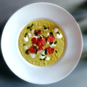 Rosenkohlsuppe mit geschmolzenen Tomaten, Korianderöl und Joghurt
