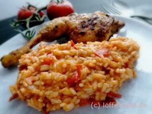 Die getrockneten Tomaten mit heißem Wasser übergießen und stehen lassen. Backofen auf 200 Grad Umluft vorheizen. Tomaten halbieren, den Strunk entfernen mit 2 EL Olivenöl, dem Knoblauch vermengen und mit der Schnittfläche nach unten auf ein mit Backpapier ausgelegtes Backbleich legen, 20 Minuten backen. In einen Topf Butter zerlassen und den Risottoreis gewaschen hinzugeben, den Reis etwas anbraten. Schalotten fein gehackt dazugeben. Kurz weiter zusammen anbraten und mit Wießwein ablöschen und während man immer weiter rührt einkochen lassen. Die Hitze reduzieren die Tomaten aus dem Backofen pürieren und diese zu dem Risottoreis gießen. Nach und nach die Gemüsebrühe unter ständigem Rühren hinzufügen, einkochen lassen, dass ganze mehrmals wiederholen, bis euch die Konsistenz eures Risotto schlotzig genug erscheint und ihr die Hälfte des Parmesan unter das Risotto heben könnt. Das restliche Parmesan nehmt ihr zum Anrichten eures Tellers mit Hähnchenschenkel und dem Risotto. Guten Appetit ihr lieben Foodies, lasst es