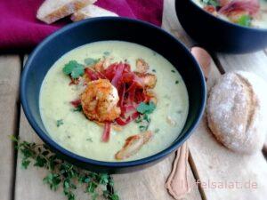 Butter and garlic to fry for the prawns and flour for flour. Chop the vegetable onion and 2 cloves of garlic and sauté in olive oil in a saucepan. Deglaze with the broth. Let simmer a little. Remove the avocado meat from the avocado and add to the soup. Add a few sprigs of fresh coriander and immediately puree everything together with the creme fraiche. Take it off the stove. Salt, pepper, add the lime and lemon juice. Season to taste with balsamic cream, honey and cayenne pepper. Cut the Bündnerfleisch into fine strips. Season the prawns with salt and pepper and cayenne pepper. Turn in the flour and shake off the rest of the flour. Melt the butter in the pan, add 4 slices of chopped garlic. Fry briefly on both sides. Serve the lukewarm soup. Garnish with prawns, Bündnerfleisch and fresh lemon thyme and coriander. Pour the roasted garlic with the clarified butter over the soup.