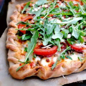 After two Hours minimum, roll out the dough as thinly as possible and pull it apart. Place on a baking sheet with parchment paper and brush with the tomato sauce. Place the ingredients on the pizza. Don’t forget the thinly sliced ​​garlic cloves, they give the pizza a special flavor. Finish with the tomatoes Put the pizza in an oven preheated to 250 degrees top and bottom heat and after about 10 minutes spread the sliced ​​or hand-plucked mozzarella over the pizza, back in the oven until the mozzarella melts. Top with rocket salad before serving.
